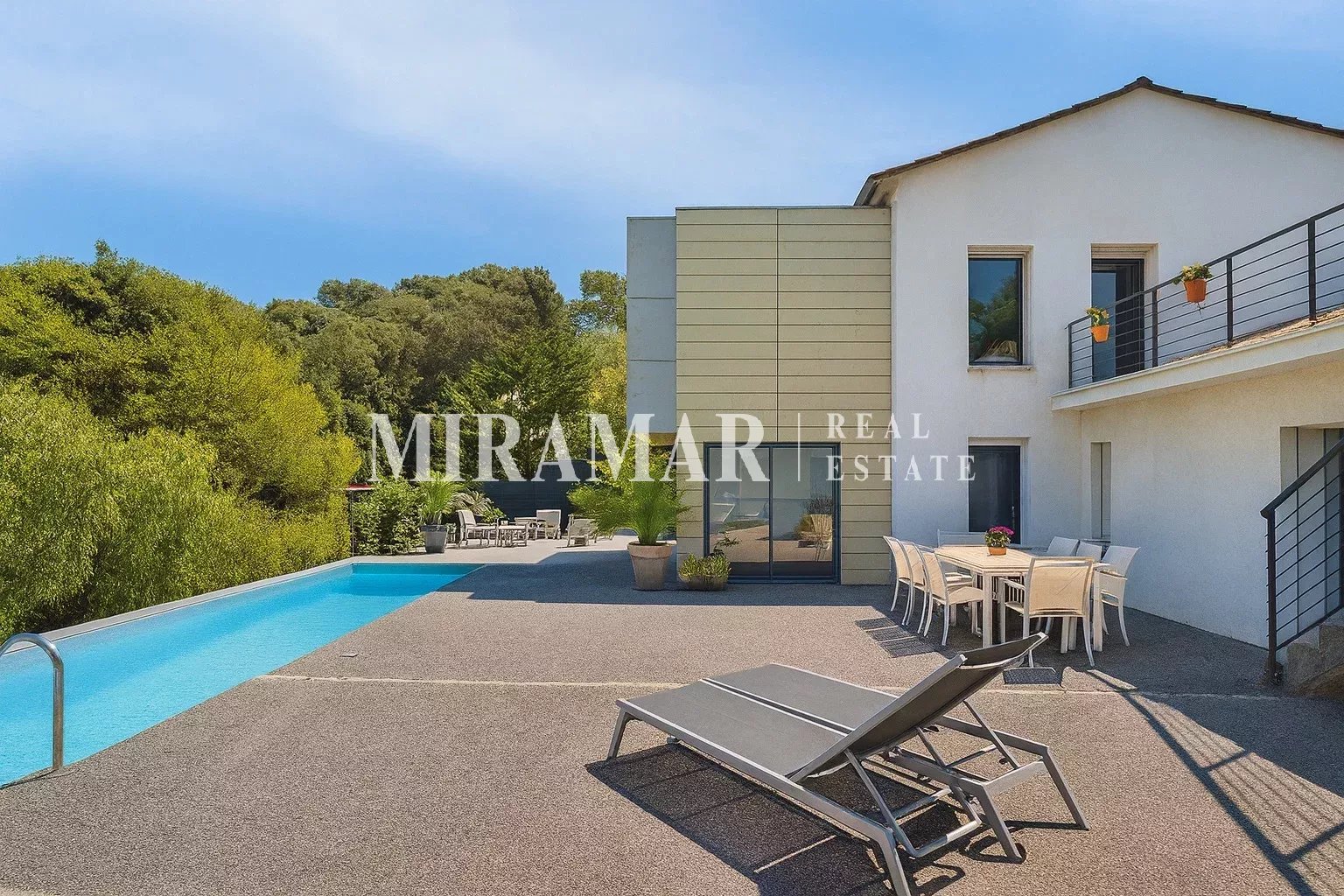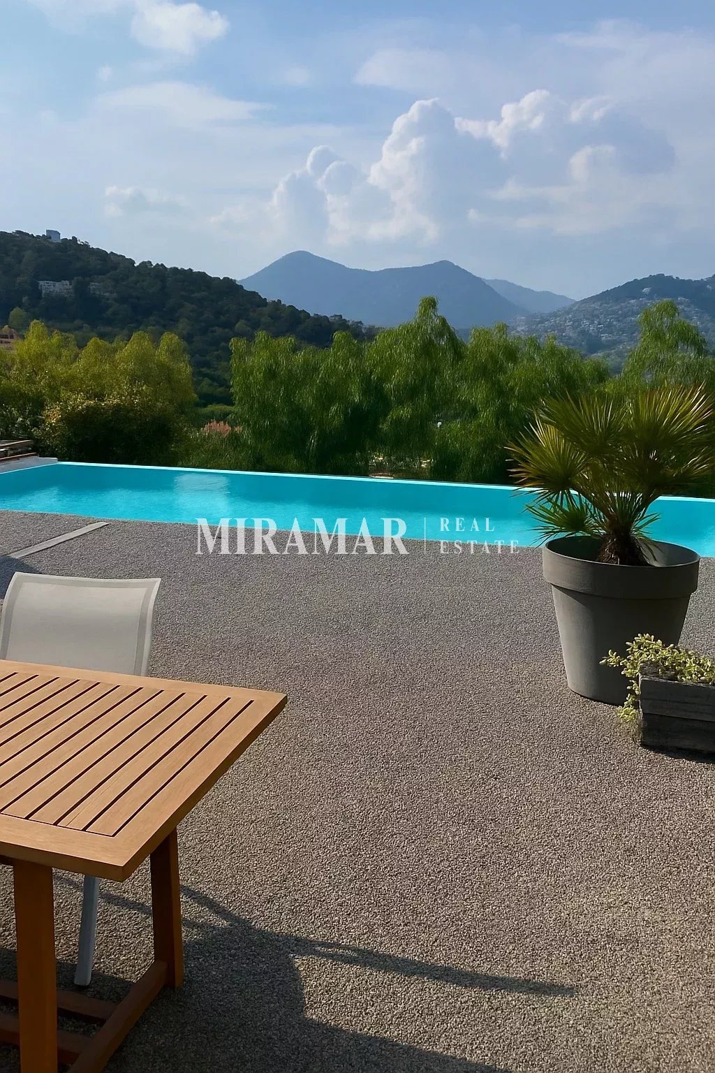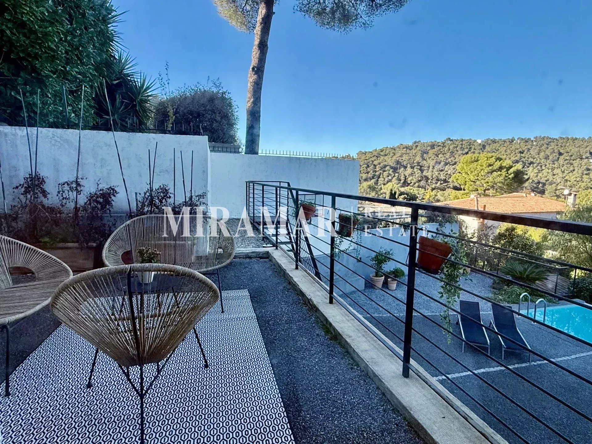 Vaste terrasse bordant la piscine et belles restanques arborées.